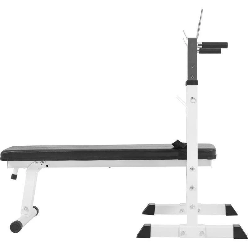 Tolle Trainingsmöglichkeit für zu Hause: Die Hantelbank mit Ablage unterstützt dich beim Üben mit der Langhantel in verschiedenen Positionen. Verstelle die Bank mit wenigen Handgriffen im Neigungswinkel und nutze sie als Schrägbank. Ihr solider Stand wird mit breiten Auflagen und gummierten Füssen gesichert. Wenn du es nicht benötigst, klappst du das praktische Gerät einfach nach oben zusammen und nutzt den Raum für andere Übungen. Die Hantelablage am Kopfende wird in fünf verschiedenen Höhen zwischen 92 Zentimetern und 112 Zentimetern eingestellt. Damit findest du die optimale Einstellung für eine ausgewogene Belastung, ohne Gelenke und Bänder zu überdehnen. Die Hantelbank mit Ablage hat integrierte Dip-Griffe, die du für das Trainieren deines Trizeps nutzt. Sie sind mit einer Beschichtung versehen, die für einen guten Grip sorgt. Bei Übungen für deine Bauchmuskeln klemmst du die Füsse in den integrierten Sicherungsgurt, um einen guten Halt zu haben. Die Bank darf auf der Liegefläche mit maximal 200 Kilogramm belastet werden. Auf der Hantelablage sind maximal 200 Kilogramm zulässig. Die Hantelbank mit Ablage wird mit Aufbauanleitung geliefert und kann in den Farben Schwarz/Silber oder Weiss/Silber bestellt werden.